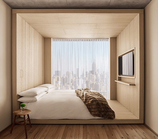 according to the hotel, all 367 rooms come with the fastest wireless internet new york city has to offer, as well as a 50″ smart TV, floor-to-ceiling windows, and touch-controlled blackout shades. loft guest rooms feature open plan layouts with distinct zones for sleeping, relaxing, working, and entertaining.